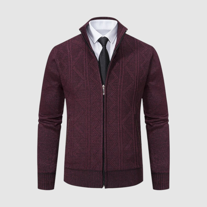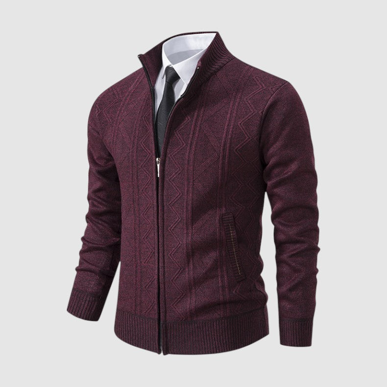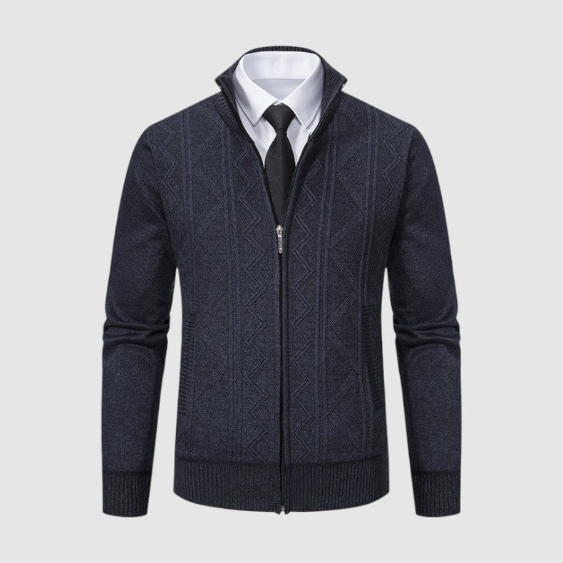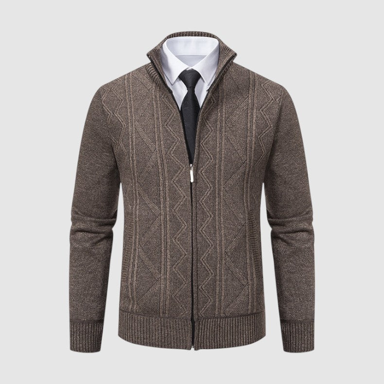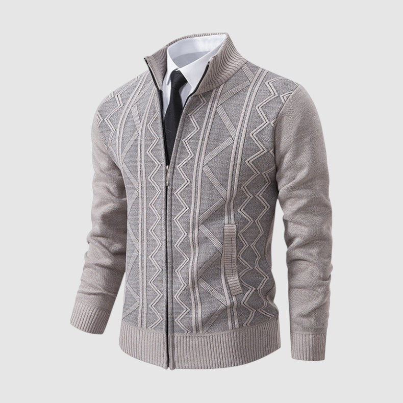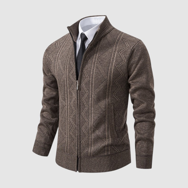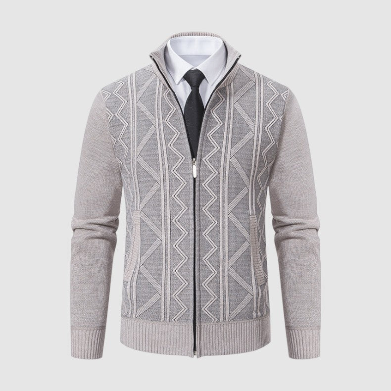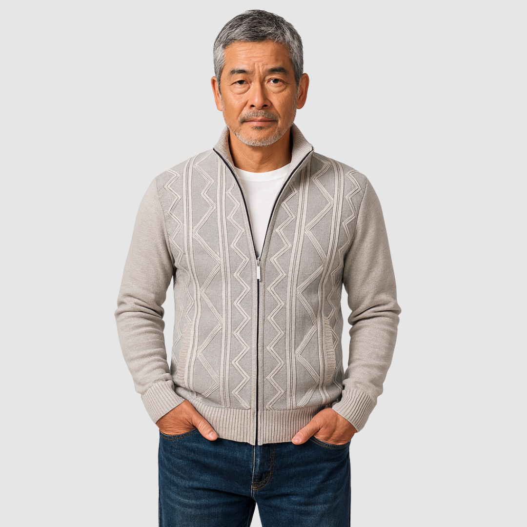 エドワード・ニットカーディガンで洗練を纏うスタイルと快適さを見事に調和させた一着。幾何学模様の上品な編み地と、シックなジップアップデザインが、ビジネスから休日までシーンを選ばず活躍します。