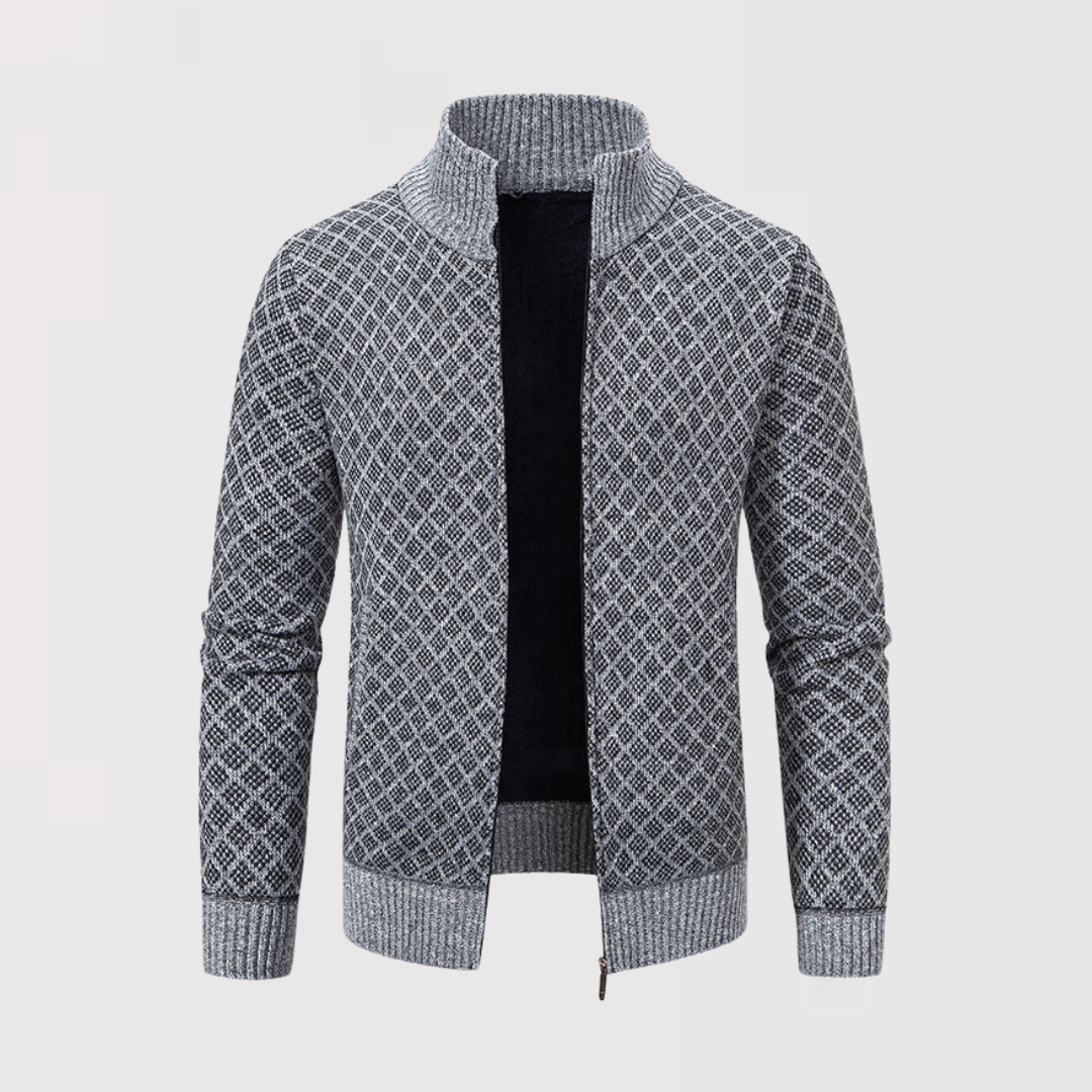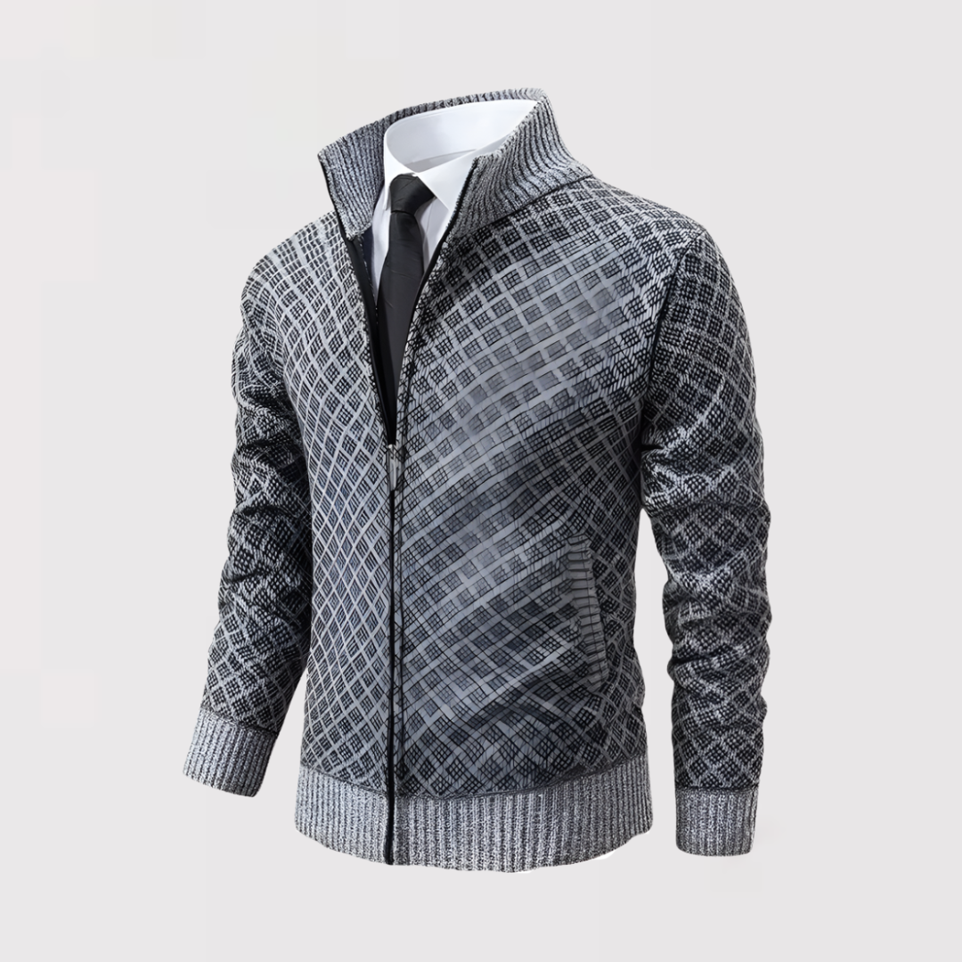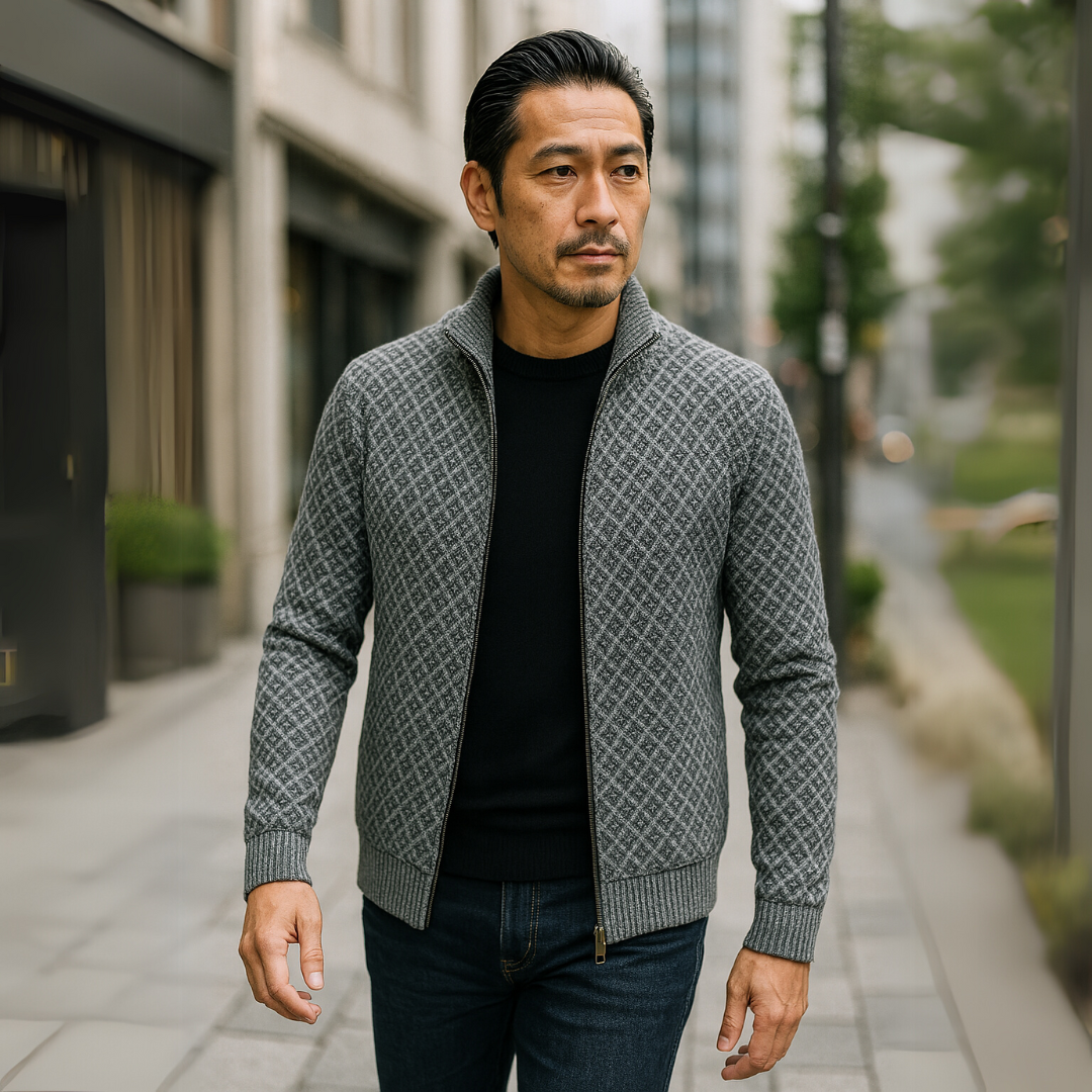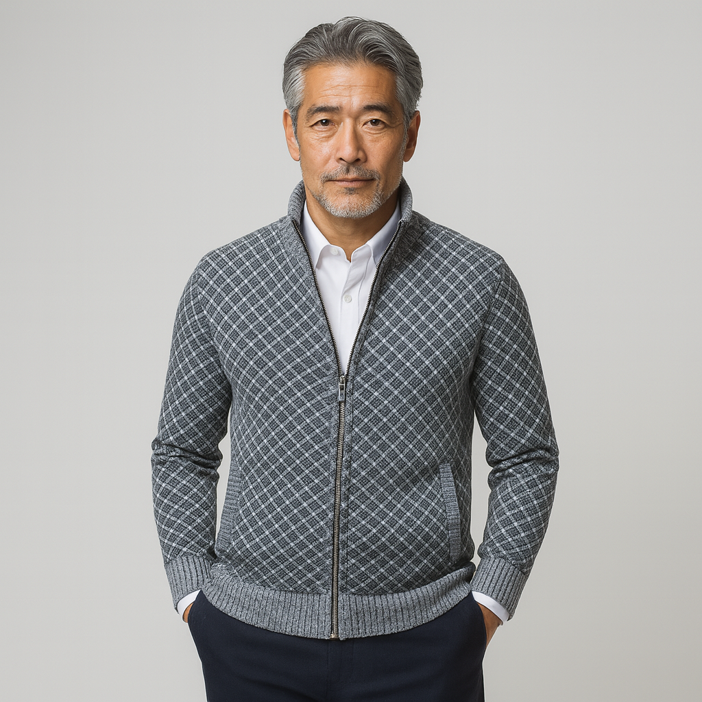 洗練と快適さを兼ね備えた、精巧に仕立てられたカーディガンを発見してください。繊細なダークグレーの幾何学模様が特徴のこのカーディガンは、エレガントなデイリースタイルを新たに定義します。