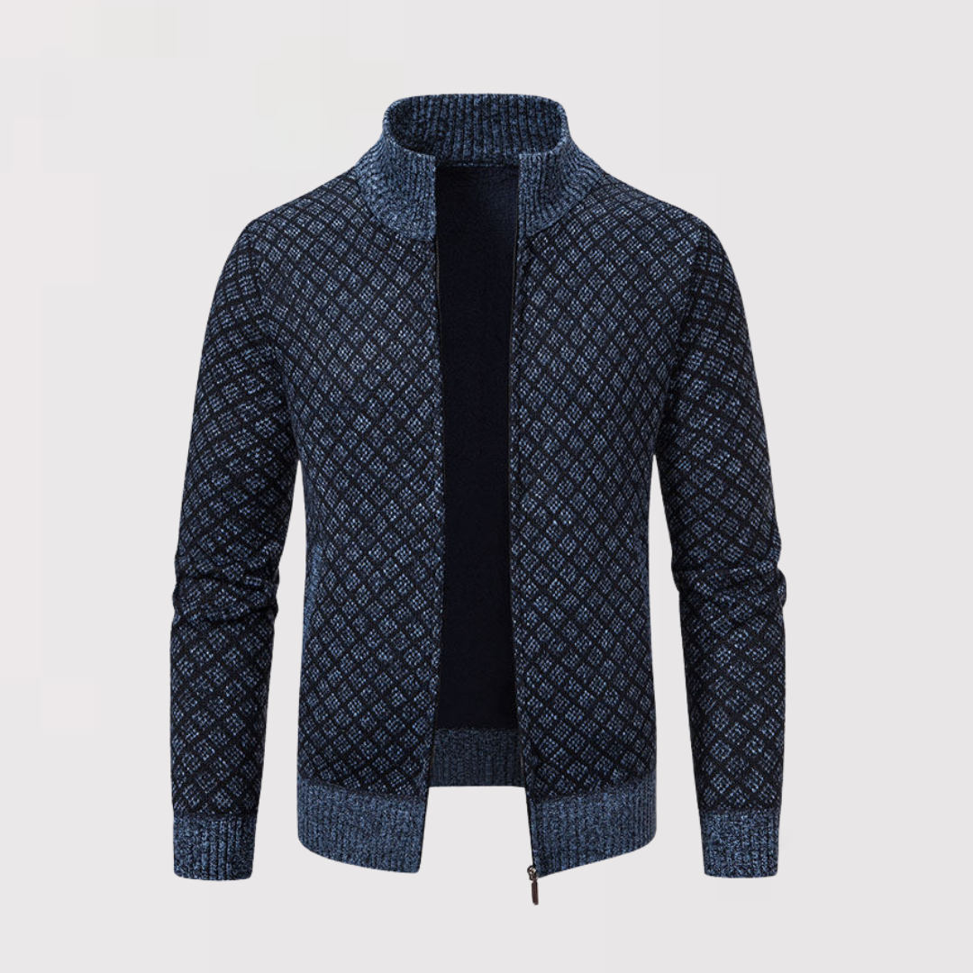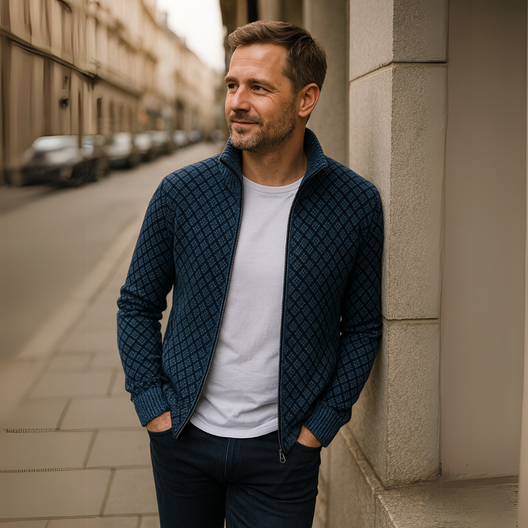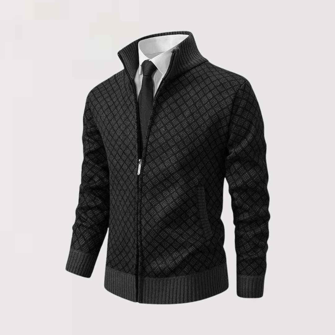洗練と快適さを兼ね備えた、精巧に仕立てられたカーディガンを発見してください。繊細なダークグレーの幾何学模様が特徴のこのカーディガンは、エレガントなデイリースタイルを新たに定義します。