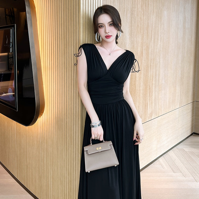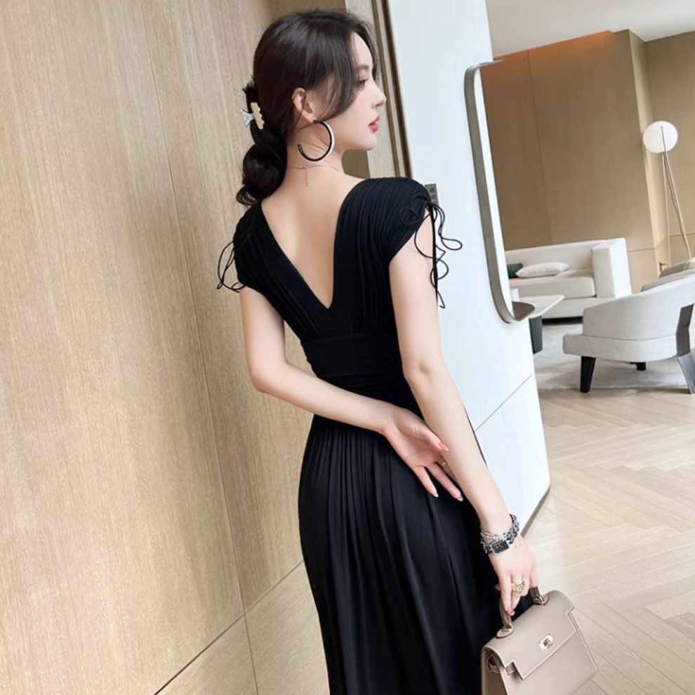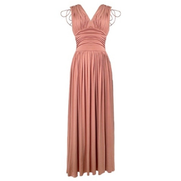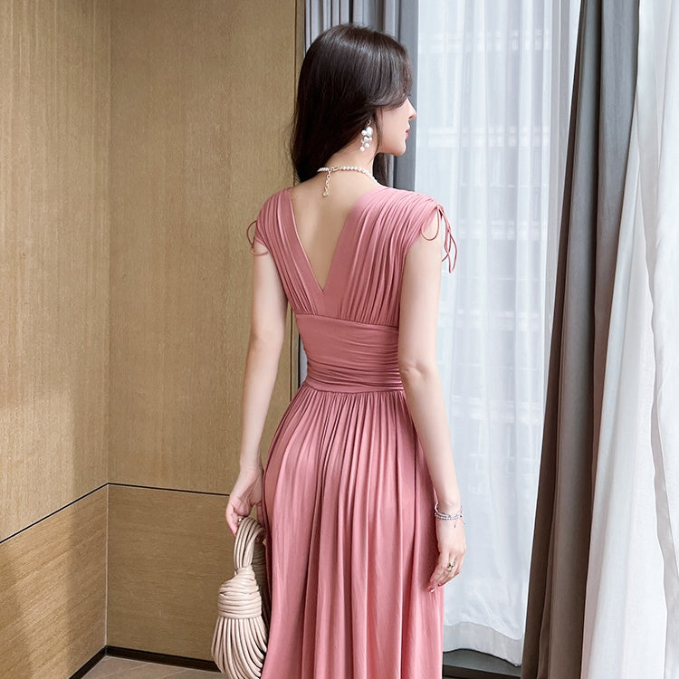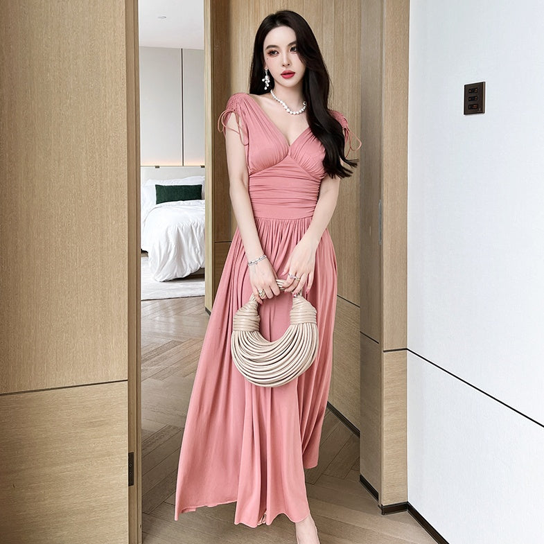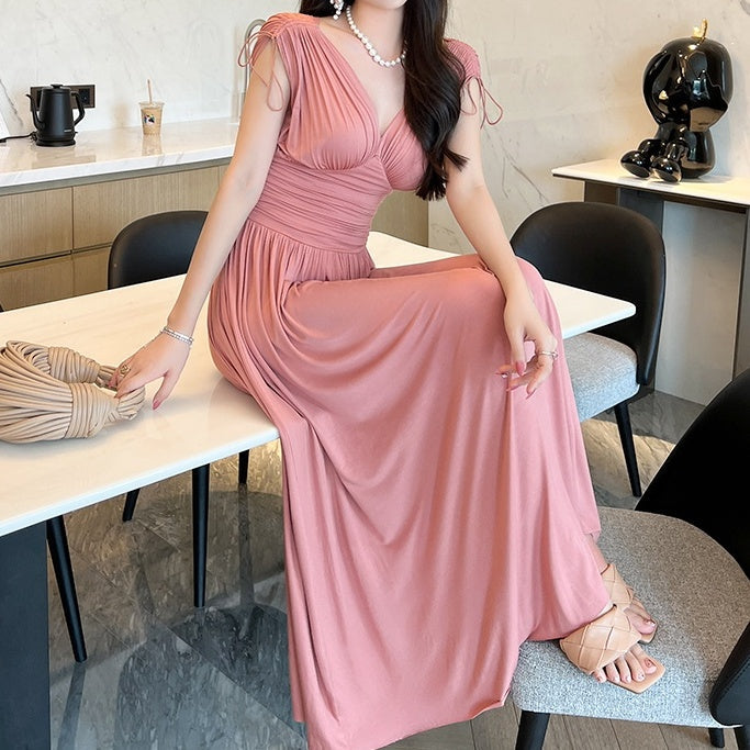 Vネックシャーリングロングワンピース