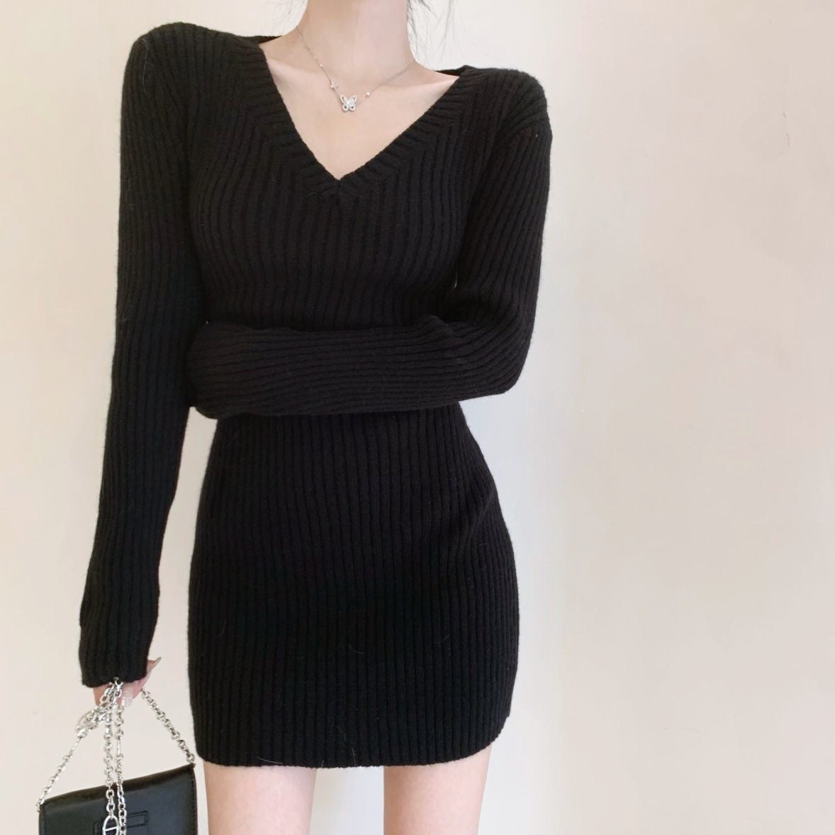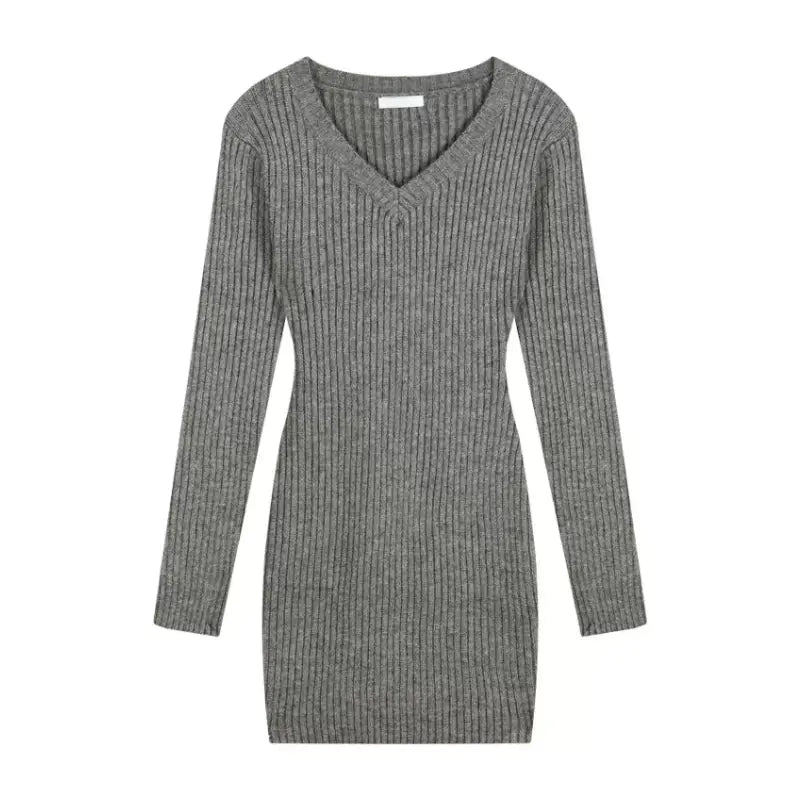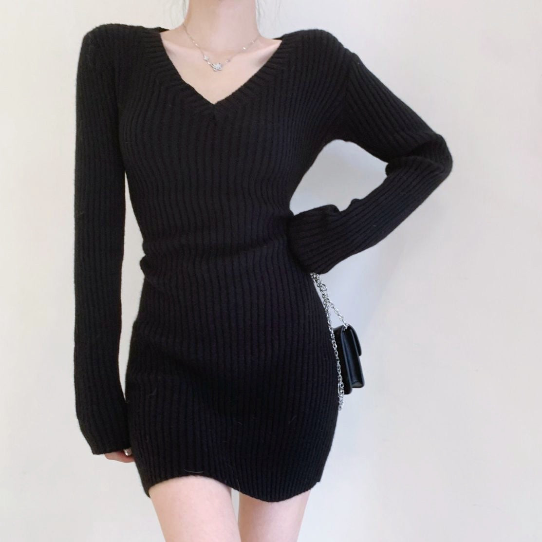 Vネックリブミニワンピース