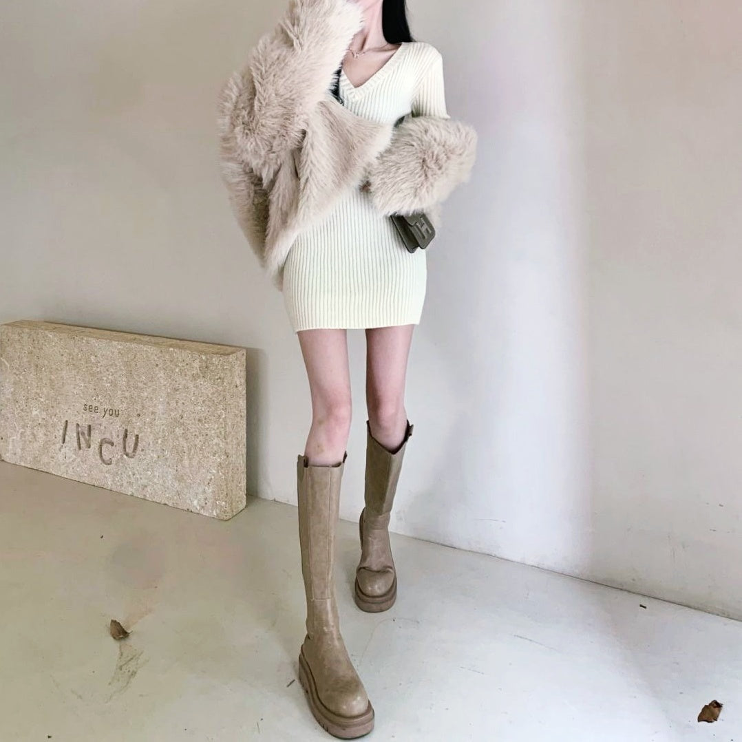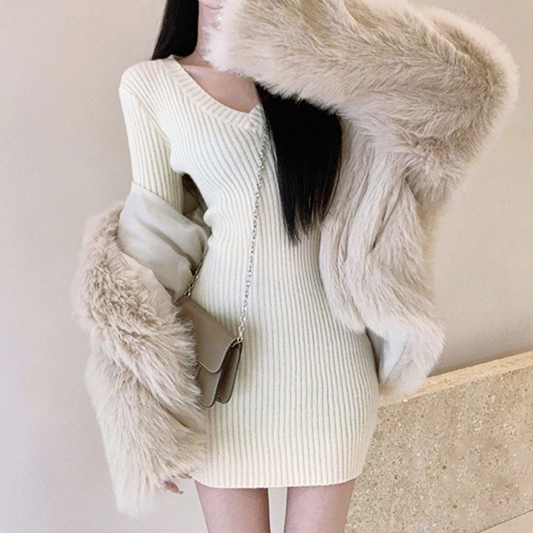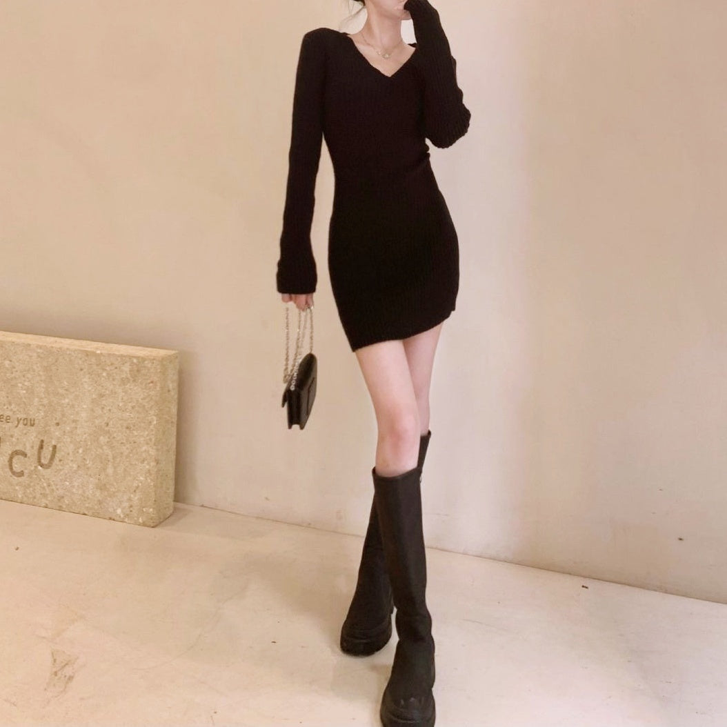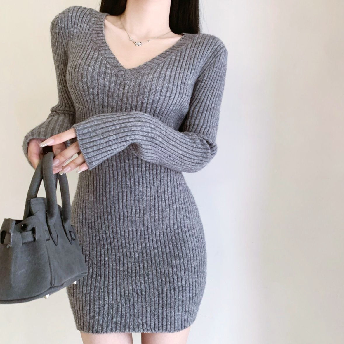 Vネックリブミニワンピース
