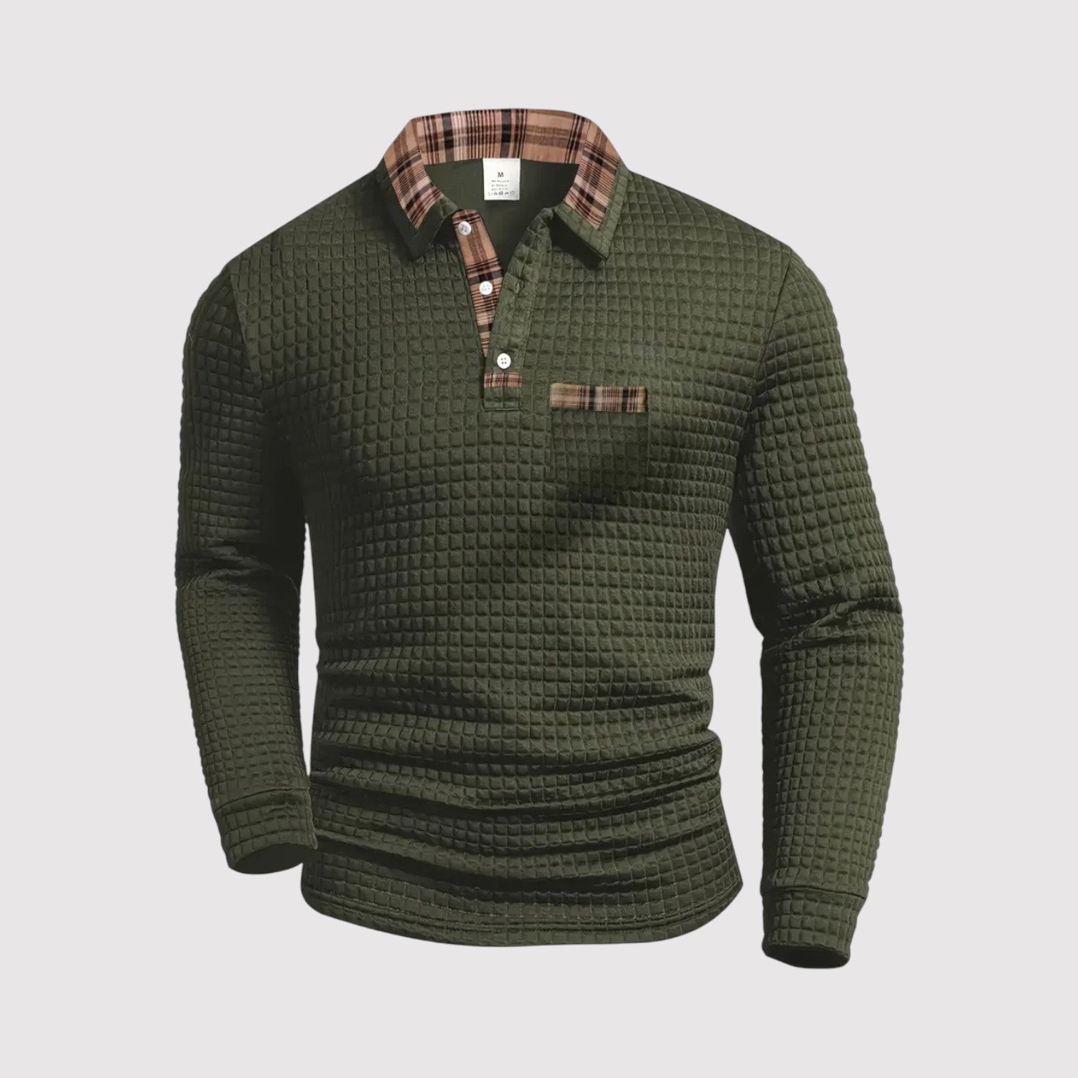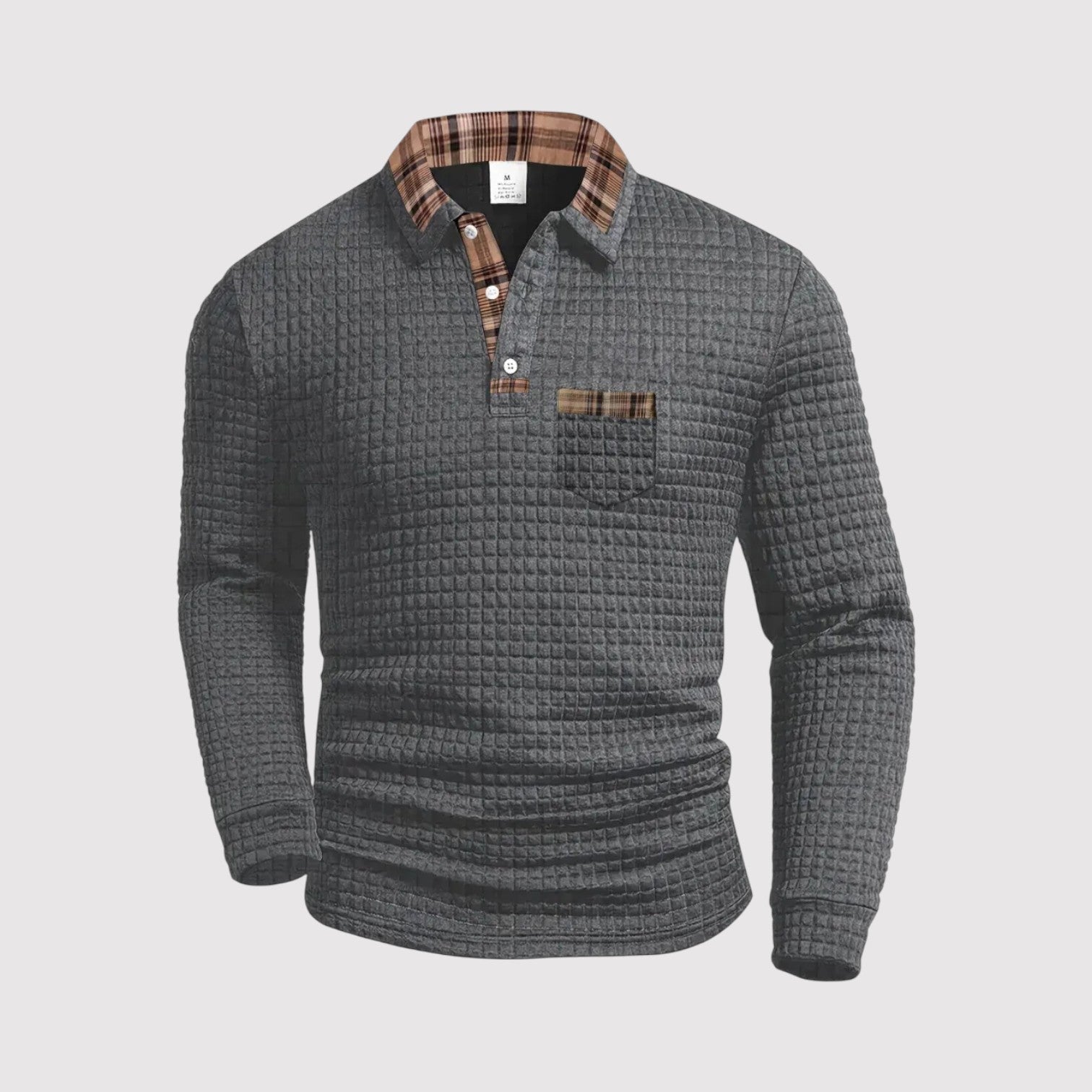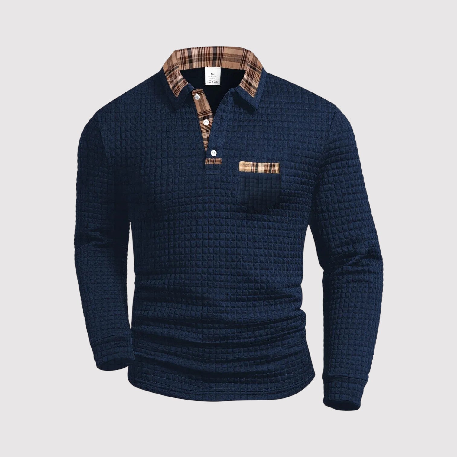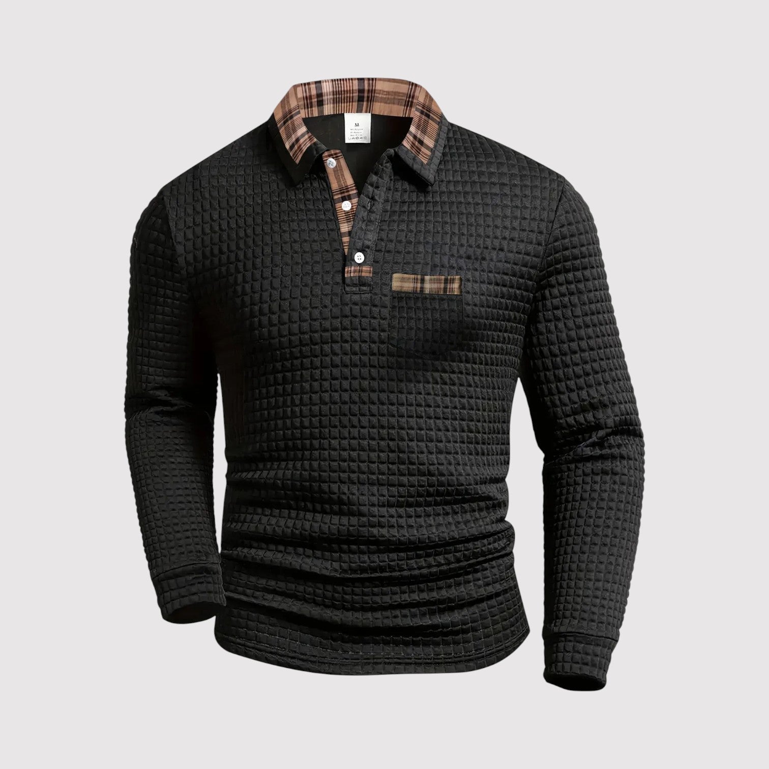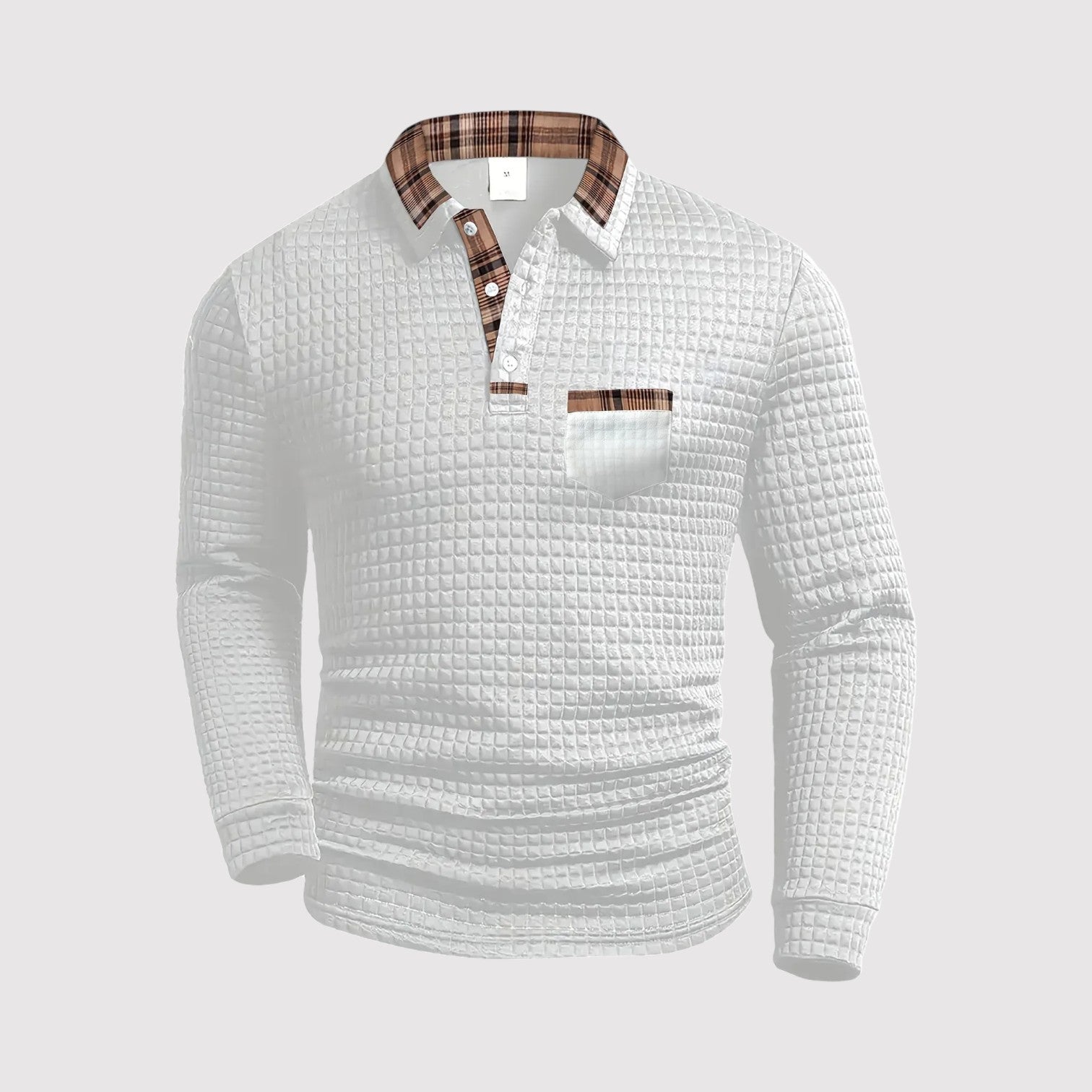 上質なコットン素材で仕立てられたこのプレミアムポロシャツは、落ち着いた自信を纏いたい大人の男性に最適です。繊細なワッフルテクスチャーとチェックのアクセントが、シンプルな装いに品格と深みを加えます。